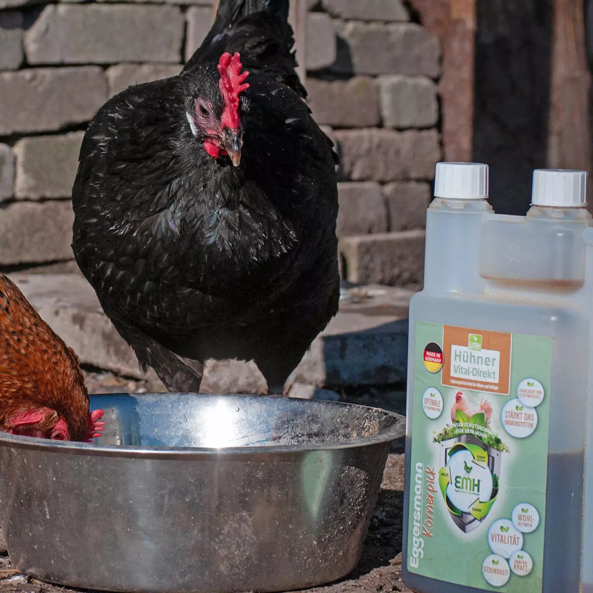Unser EMH Hühner Vital-Direkt ist ein Flüssigkonzentrat, dass das Immunsystem und die Darmflora Ihrer Hühner auf natürliche Weise unterstützen kann. Das Milieu der Darmflora kann durch Stress und andere Belastungen wie z.B. Krankheiten empfindlich gestört und verändert werden. Bakterien, die in ihrem Stoffwechsel gärende und saure Stoffe produzieren, finden so ideale Lebensbedingungen. Verschiedene Abbauprodukte können den gesamten Stoffwechsel erheblich ungünstig beeinflussen und so das Immunsystem schwächen. Durch den regelmäßigen Einsatz von EMH Hühner Vital-Direkt kann eine bessere Bioverfügbarkeit der zugeführten Nähr- und Wirkstoffe erreicht werden. Die Stoffwechselvorgänge können auf natürliche Weise unterstützt und wieder in Balance gebracht werden.