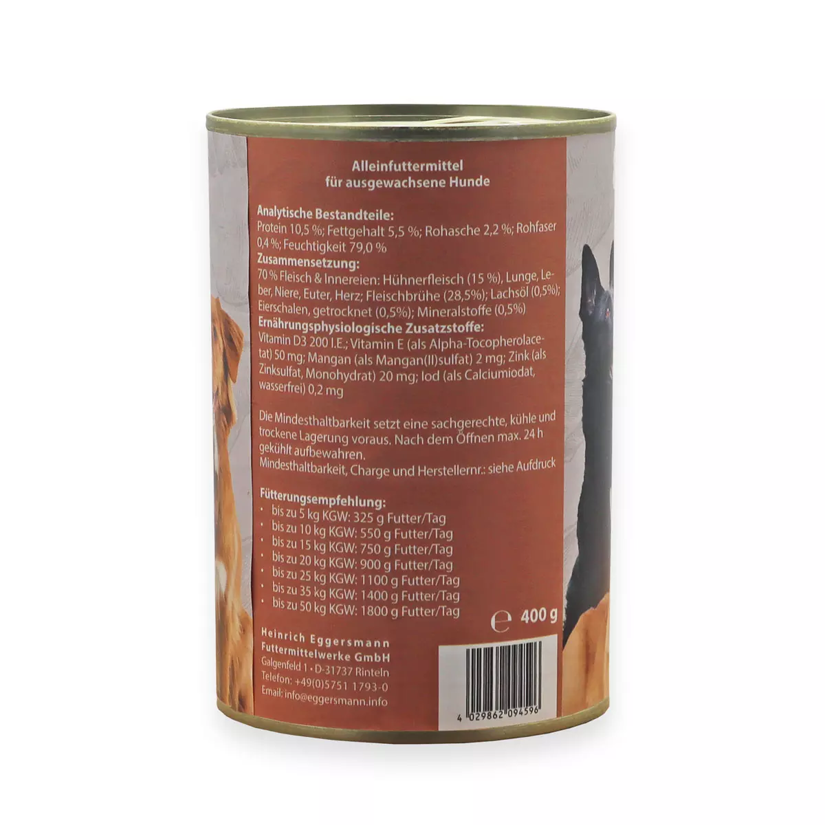 Unser Eggersmann Carnebello mit reichlich Huhn ist ein schmackhaftes Nassfutter mit einem vergleichsweise geringen Energiegehalt, sodass es auch für ältere Hunde bestens geeignet ist. Das erstklassige, fettarme Hühnerfleisch ist gut verdaulich und sorgt für eine feste Fleischstruktur. Durch die Kombination mit Lachsöl und wertvollen Omega-3-Fettsäuren wird Ihr Hund mit allen notwendigen Nährstoffen versorgt. Denn durch die besonders schonende Garung sind noch alle wichtigen Vitamine, Spurenelemente sowie Mineralstoffe im verzehrfertigen Futter enthalten. Durch den kompletten Verzicht auf Getreide, Zucker, wie auch künstliche Farb- und Geschmacksstoffe bieten Sie Ihrem Hund mit unserem Nassfutter eine nicht nur köstliche, sondern auch gesunde Mahlzeit. Unser Eggersmann Carnebello mit reichlich Huhn ist als Alleinfutter für ausgewachsene Hunde geeignet, kann aber auch beliebig mit Trockennahrung kombiniert werden.