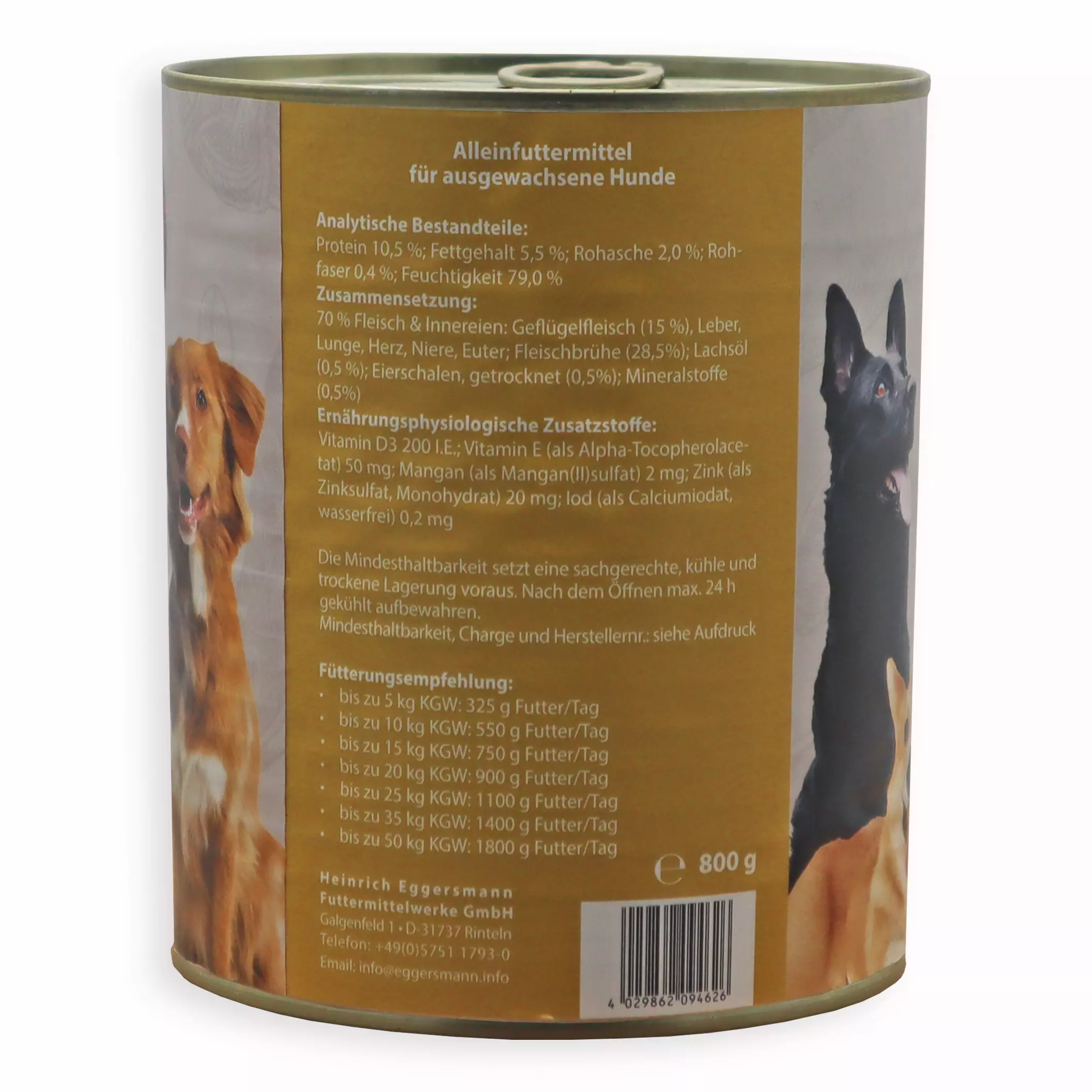 Unser Eggersmann Carnebello mit reichlich Geflügel ist ein hochwertiges Nassfutter mit einer besonders schmackhaften Konsistenz, da es saftiges Muskelfleisch mit einer festen Fleischstruktur enthält. Der hohe Anteil an erstklassigem, leicht verdaulichem Geflügelfleisch, Lachsöl und Omega-3-Fettsäuren versorgt Ihren Hund mit allen notwendigen Nährstoffen. Denn durch die besonders schonende Garung sind noch alle wichtigen Vitamine, Spurenelemente sowie Mineralstoffe im verzehrfertigen Futter enthalten. Durch den kompletten Verzicht auf Getreide, Zucker, wie auch künstliche Farb- und Geschmacksstoffe bieten Sie Ihrem Hund mit unserem Nassfutter eine nicht nur köstliche, sondern auch gesunde Mahlzeit. Unser Eggersmann Carnebello mit reichlich Geflügel ist als Alleinfutter für ausgewachsene Hunde geeignet, kann aber auch beliebig mit Trockennahrung kombiniert werden.