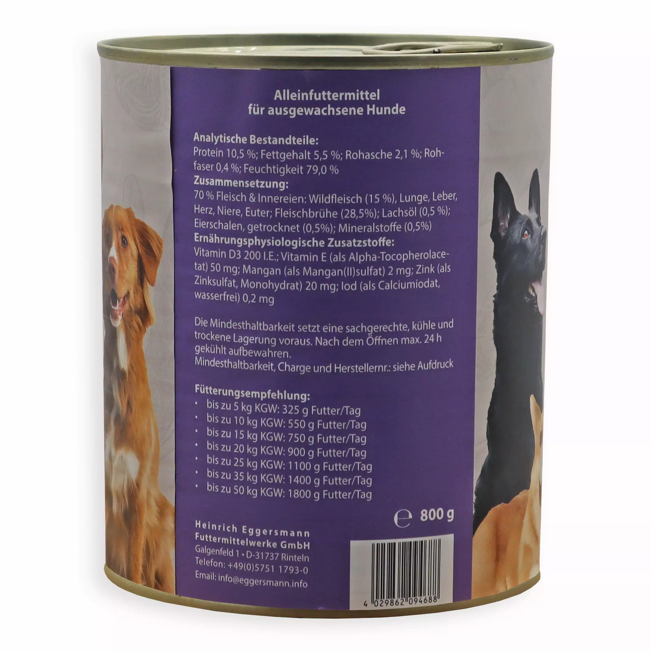 Unser Eggersmann Carnebello mit reichlich Wild ist ein hochwertiges Nassfutter für besondere Feinschmecker. Durch den hohen Anteil an erstklassigem Wildfleisch erhält es seine feste Fleischstruktur und überzeugt durch einen hohen Nährstoffanteil bei einem mageren Fettgehalt. Das saftige Muskelfleisch in Kombination mit Lachsöl und wertvollen Omega-3-Fettsäuren versorgt Ihren Hund mit allen notwendigen Nährstoffen. Denn durch die besonders schonende Garung sind noch alle wichtigen Vitamine, Spurenelemente sowie Mineralstoffe im verzehrfertigen Futter enthalten. Durch den kompletten Verzicht auf Getreide, Zucker, wie auch künstliche Farb- und Geschmacksstoffe bieten Sie Ihrem Hund mit unserem Nassfutter eine nicht nur köstliche, sondern auch gesunde Mahlzeit. Unser Eggersmann Carnebello mit reichlich Wild ist als Alleinfutter für ausgewachsene Hunde geeignet, kann aber auch beliebig mit Trockennahrung kombiniert werden.