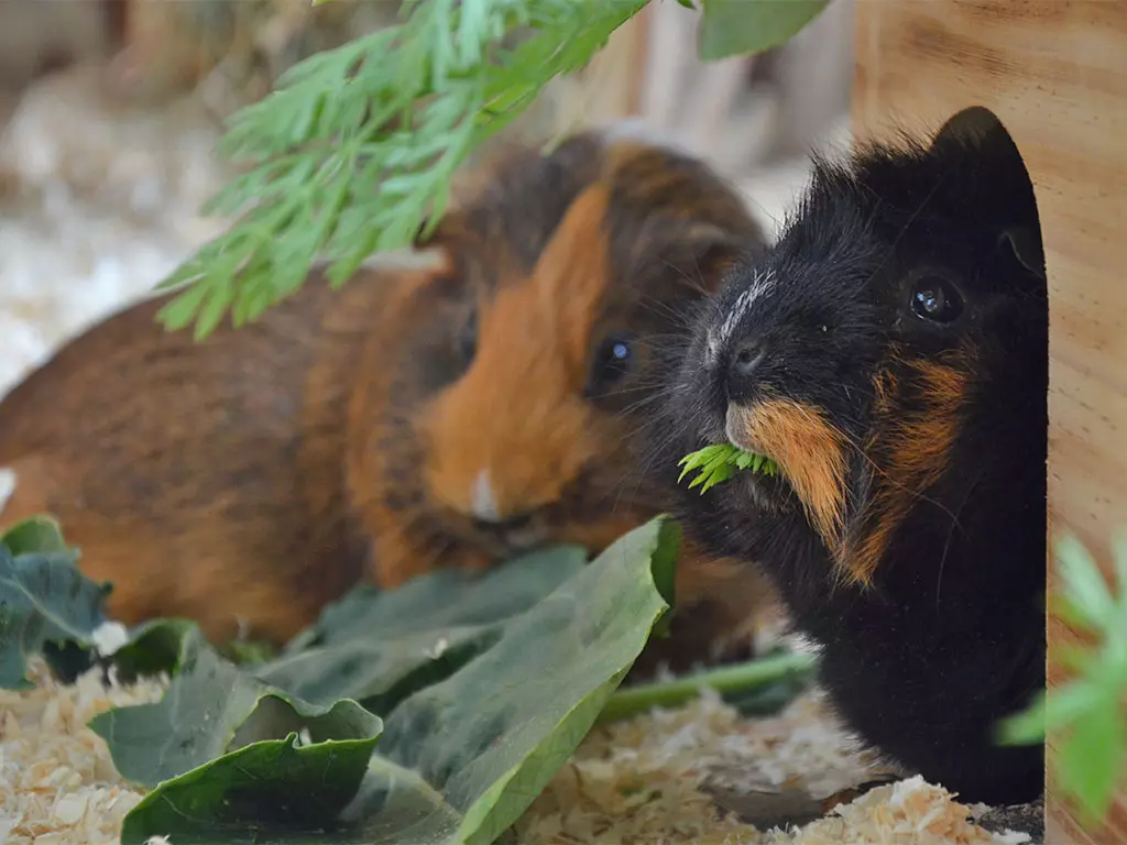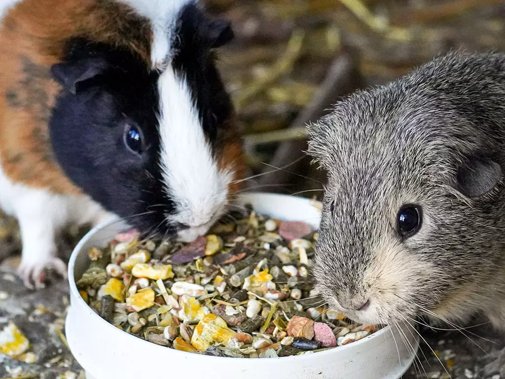 Unsere Meerschweinchen sind reine Pflanzenfresser, für die eine rohfaserreiche Nahrung essenziell wichtig ist. Um ihren hohen Energieumsatz aufrechterhalten zu können, fressen Meerschweinchen bis zu 100 kleine Futterportionen innerhalb eines Tages. Um diesen Bedarf ausreichend zu decken, sollte durchgehend hochwertiges Heu zur freien Verfügung stehen. Zusätzlich zum Heu sollte auch ausreichend Frischfutter, in Form von Kräutern, Salate, Gemüsegrün und Blattgemüse angeboten werden. Obst und Gemüse sollten, aufgrund des natürlichen Zuckergehalts, nur in kleinen Mengen verfüttert werden. Auch Trockenfutter können Sie in kleinen Mengen, als Ergänzung, zum Frischfutter anbieten. Allgemein empfiehlt es sich, den Meerschweinchen mehrmals täglich kleinere Mahlzeiten zufüttern, anstatt einer großen täglichen Ration.