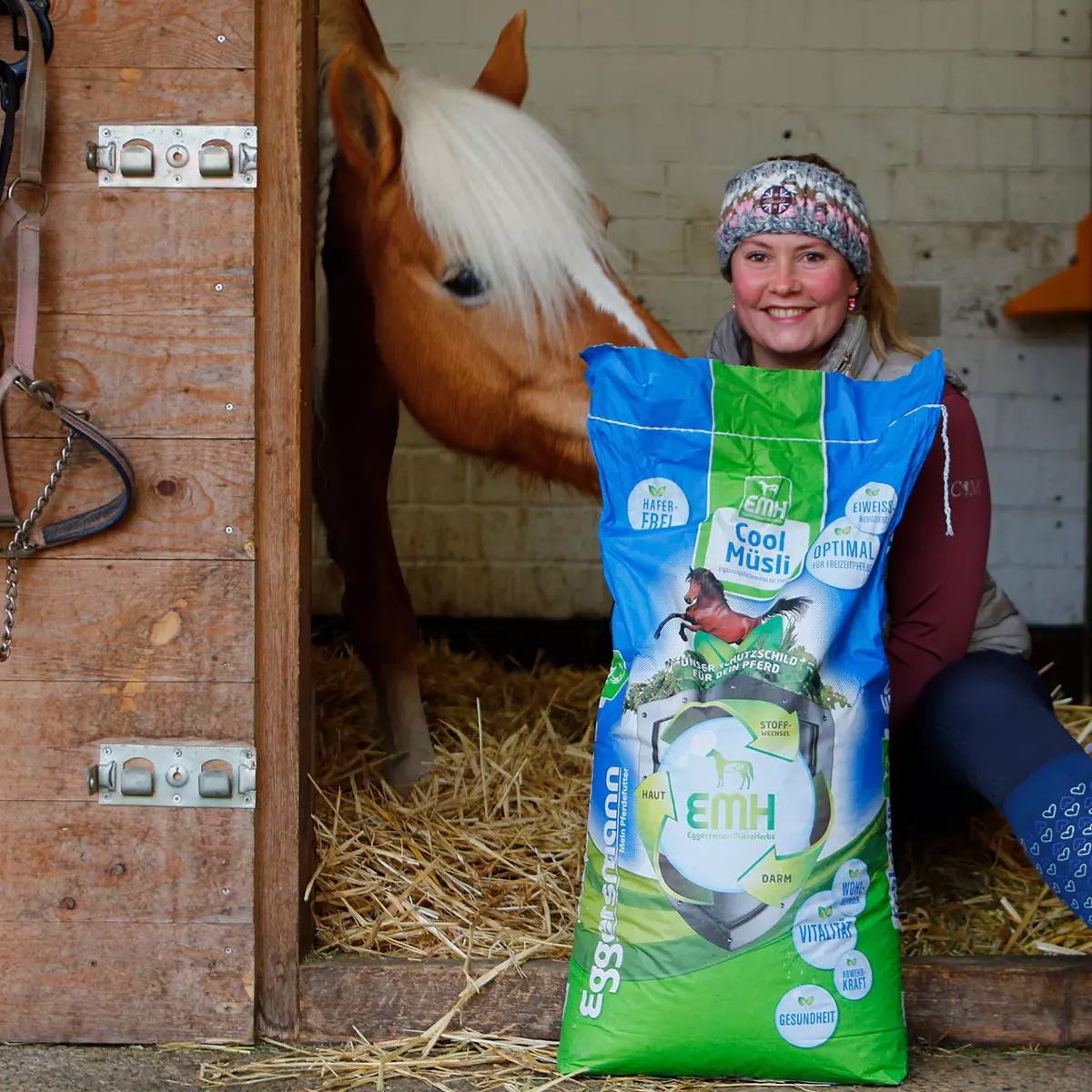 EMH Cool Müsli ist ein haferfreies und schmackhaftes Müsli auf der Basis von hydrothermisch aufgeschlossenem Getreide. Grundlage der Rezeptur dieser Mischung war der Wunsch vieler Pferdehalter, ein ausgeglichenes, nervenstarkes, aber leistungsfähiges Pferd als Freizeitpartner zur Seite zu haben. Die haferfreie Rezeptur enthält alle wichtigen Nährstoffe, um den täglichen Kraftfutterbedarf Ihres Pferdes schon in geringer Dosierung zu decken. Die Spurenelemente Kupfer, Zink und Selen liegen in erhöhter Konzentration vor. Die Mineralisierung sorgt dafür, dass Mängel im Grundfutter ausgeglichen werden, und unterstützt zahlreiche Funktionen im Körper. Dank reduzierter Eiweiß- und Energiegehalte entlastet es den Stoffwechsel und empfiehlt sich für alle weniger beanspruchten Pferde und Ponys als alleiniges Krippenfutter oder als Ergänzung zu Getreide. Durch den Zusatz von EMH kann das Verdauungssystem in seiner Funktion gezielt unterstützt und entlastet werden. So sorgt EMH Cool Müsli mit angepassten Nähr- und Wirkstoffen sowie dem Plus an Magnesium für vitale Pferde, die einen »coolen« Kopf bewahren sollen.