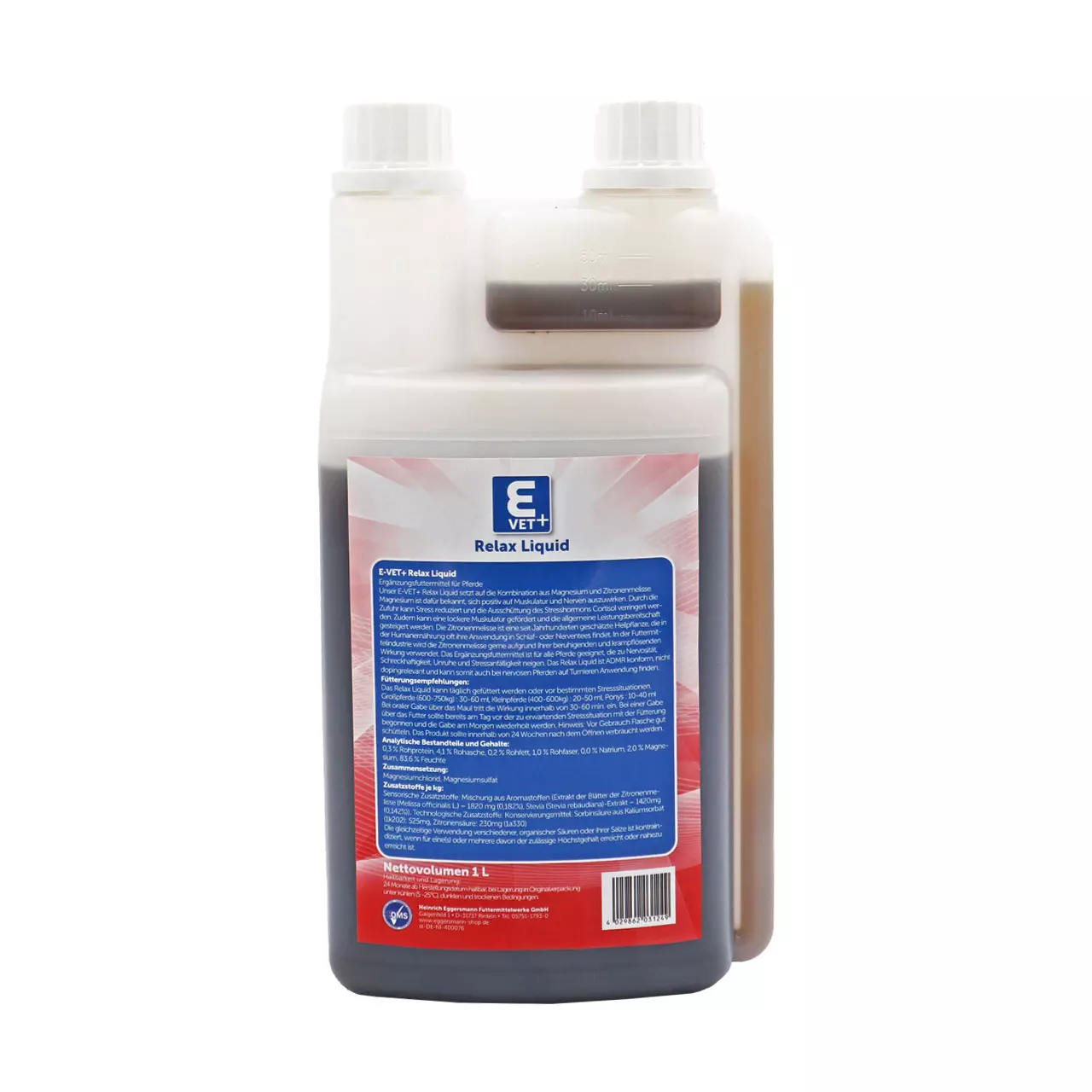 Die innovative Zusammensetzung unseres E-VET+ Relax Liquid kann nervöse und schreckhafte Pferde zu mehr Ruhe und Gelassenheit verhelfen. Magnesium ist dafür bekannt, sich positiv auf Muskulatur und Nerven auszuwirken. Durch die Zufuhr kann Stress reduziert und die Ausschüttung des Stresshormons Cortisol verringert werden. Zudem kann eine lockere Muskulatur gefördert und die allgemeine Leistungsbereitschaft gesteigert werden. Die Zitronenmelisse ist eine seit Jahrhunderten geschätzte Heilpflanze, die in der Humanernährung oft ihre Anwendung in Schlaf- oder Nerventees findet. In der Futtermittelindustrie wird die Zitronenmelisse gerne auf Grund Ihrer beruhigenden und krampflösenden Wirkung verwendet. Das Ergänzungsfuttermittel ist für alle Pferde geeignet, die zu Nervosität, Schreckhaftigkeit, Unruhe und stressanfällig neigen. Das Relax Liquid ist ADMR Konform, nicht dopingrelevant und kann somit auch bei nervösen Pferden auf Turnieren Anwendung finden.