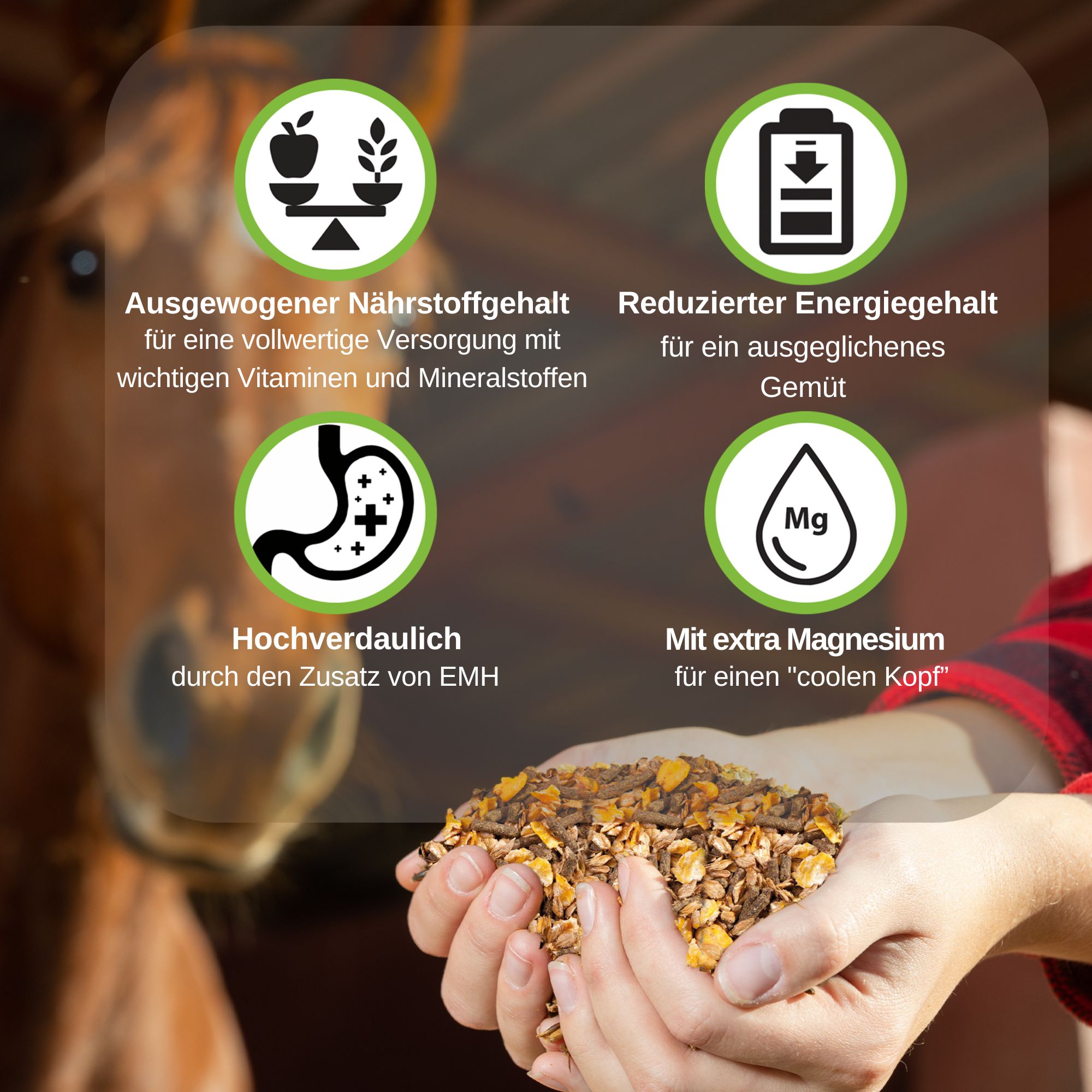 EMH Cool Müsli ist ein haferfreies und schmackhaftes Müsli auf der Basis von hydrothermisch aufgeschlossenem Getreide. Grundlage der Rezeptur dieser Mischung war der Wunsch vieler Pferdehalter, ein ausgeglichenes, nervenstarkes, aber leistungsfähiges Pferd als Freizeitpartner zur Seite zu haben. Die haferfreie Rezeptur enthält alle wichtigen Nährstoffe, um den täglichen Kraftfutterbedarf Ihres Pferdes schon in geringer Dosierung zu decken. Die Spurenelemente Kupfer, Zink und Selen liegen in erhöhter Konzentration vor. Die Mineralisierung sorgt dafür, dass Mängel im Grundfutter ausgeglichen werden, und unterstützt zahlreiche Funktionen im Körper. Dank reduzierter Eiweiß- und Energiegehalte entlastet es den Stoffwechsel und empfiehlt sich für alle weniger beanspruchten Pferde und Ponys als alleiniges Krippenfutter oder als Ergänzung zu Getreide. Durch den Zusatz von EMH kann das Verdauungssystem in seiner Funktion gezielt unterstützt und entlastet werden. So sorgt EMH Cool Müsli mit angepassten Nähr- und Wirkstoffen sowie dem Plus an Magnesium für vitale Pferde, die einen »coolen« Kopf bewahren sollen.