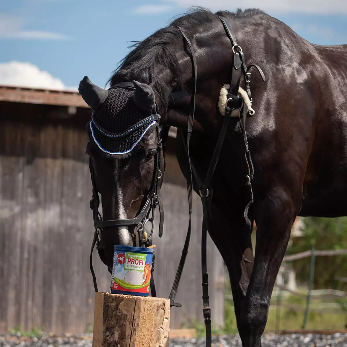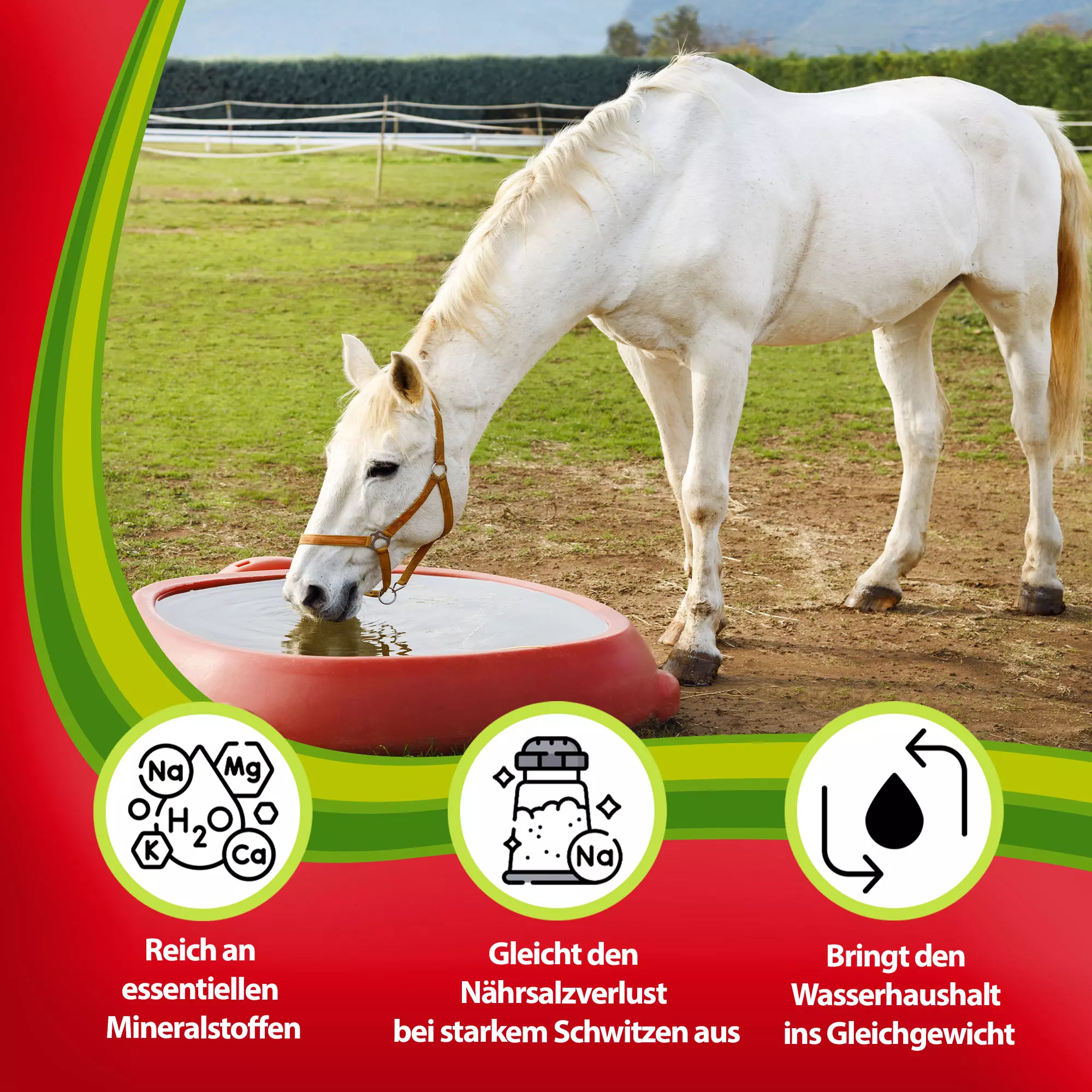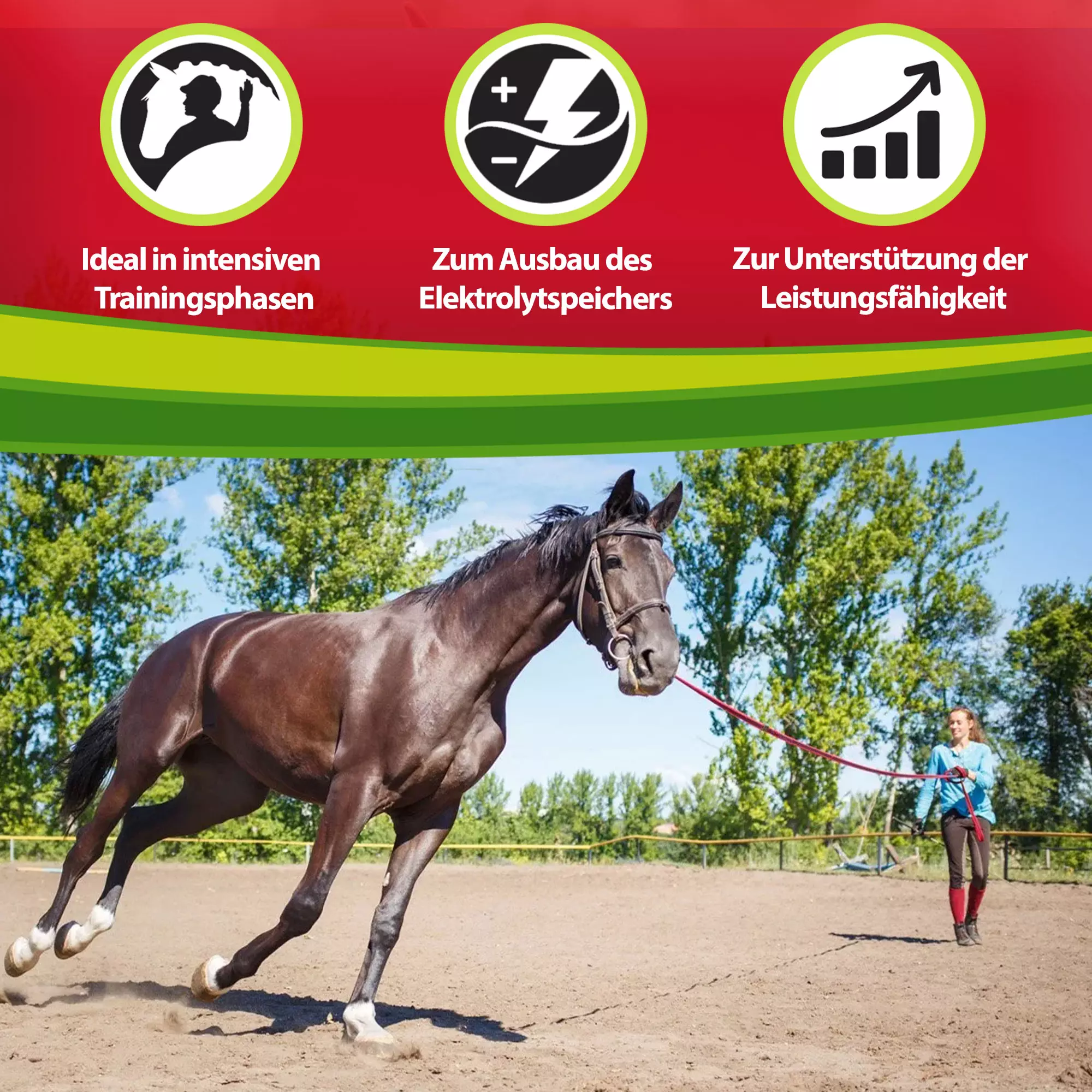 Bei hoher Leistung kann ein Pferd bis zu 25 Liter Schweiß pro Tag verlieren. Mit dem Schweiß gehen wichtige Nährsalze verloren, die für den Wasserhaushalt des Pferdes von hoher Bedeutung sind. Durch die Gabe von Elektrolyten werden die Nährstoffspeicher schnell wieder aufgefüllt.