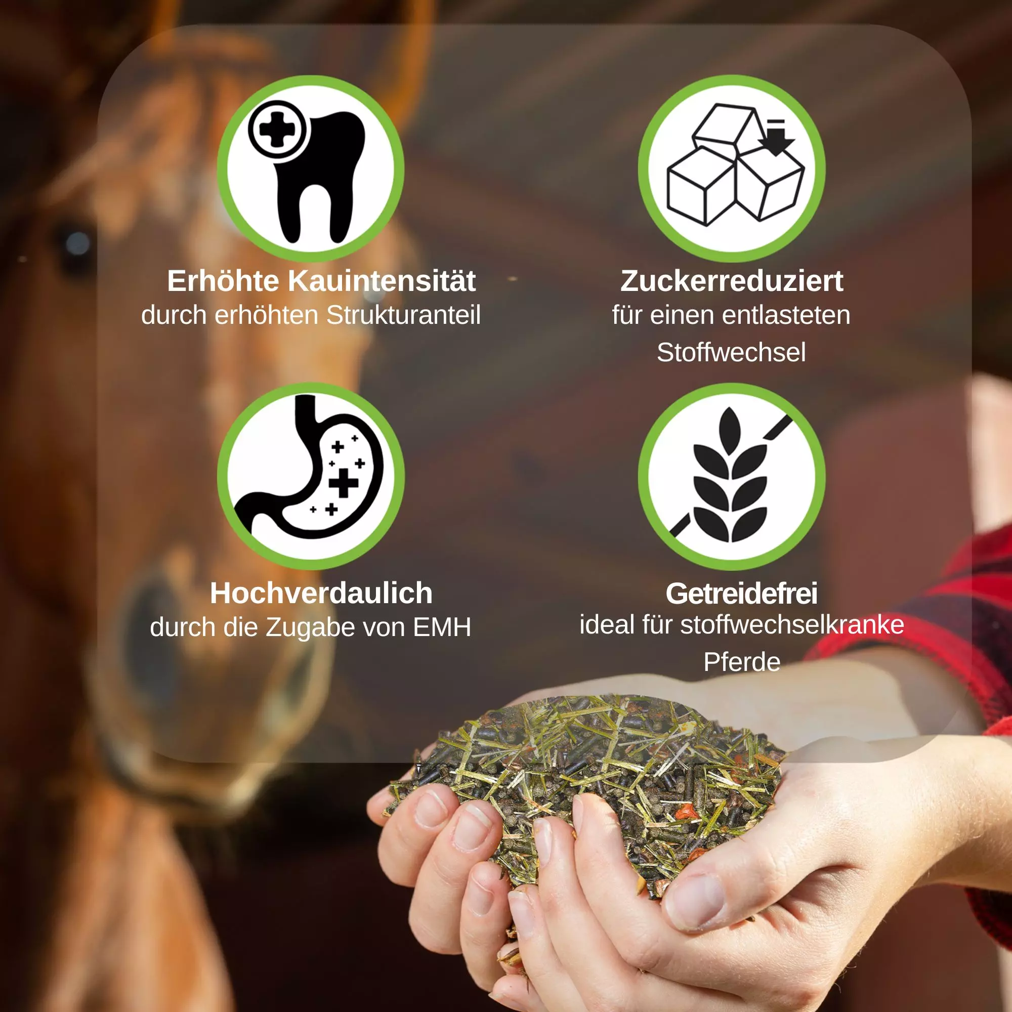 Struktur getreidefrei mit hochverdaulicher, intakter Rohfaser ist für die Fütterung stoffwechselerkrankter oder -empfindlicher Pferde konzipiert. Durch den niedrigen Stärke- und Zuckergehalt kann es den Stoffwechsel entlasten, der hohe Rohfaseranteil kann eine harmonische Dickdarmflora fördern. Sonnenblumenkerne und Reisschalenkleie liefern essentielle Fettsäuren. Luzerne zeichnet sich durch hochwertiges Protein aus und ist daher ideal, um den Körper mit Aminosäuren zu versorgen und den Muskelaufbau zu unterstützen. Schmackhafter Apfeltrester liefert wertvolle Pektine. Struktur getreidefrei kann durch seine naturnahen Inhaltsstoffe entscheidend zu einer besseren Lebensqualität Ihres Pferdes beitragen. Durch den EMH Zusatz kann die Verdauung noch optimaler unterstützt werden und so ist bei regelmäßiger Fütterung, ein verbesserter Allgemeinzustand und eine erhöhte Vitalität zu erwarten.