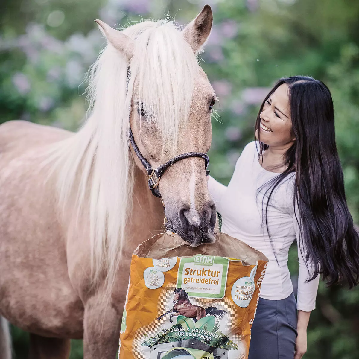 Struktur getreidefrei mit hochverdaulicher, intakter Rohfaser ist für die Fütterung stoffwechselerkrankter oder -empfindlicher Pferde konzipiert. Durch den niedrigen Stärke- und Zuckergehalt kann es den Stoffwechsel entlasten, der hohe Rohfaseranteil kann eine harmonische Dickdarmflora fördern. Sonnenblumenkerne und Reisschalenkleie liefern essentielle Fettsäuren. Luzerne zeichnet sich durch hochwertiges Protein aus und ist daher ideal, um den Körper mit Aminosäuren zu versorgen und den Muskelaufbau zu unterstützen. Schmackhafter Apfeltrester liefert wertvolle Pektine. Struktur getreidefrei kann durch seine naturnahen Inhaltsstoffe entscheidend zu einer besseren Lebensqualität Ihres Pferdes beitragen. Durch den EMH Zusatz kann die Verdauung noch optimaler unterstützt werden und so ist bei regelmäßiger Fütterung, ein verbesserter Allgemeinzustand und eine erhöhte Vitalität zu erwarten.