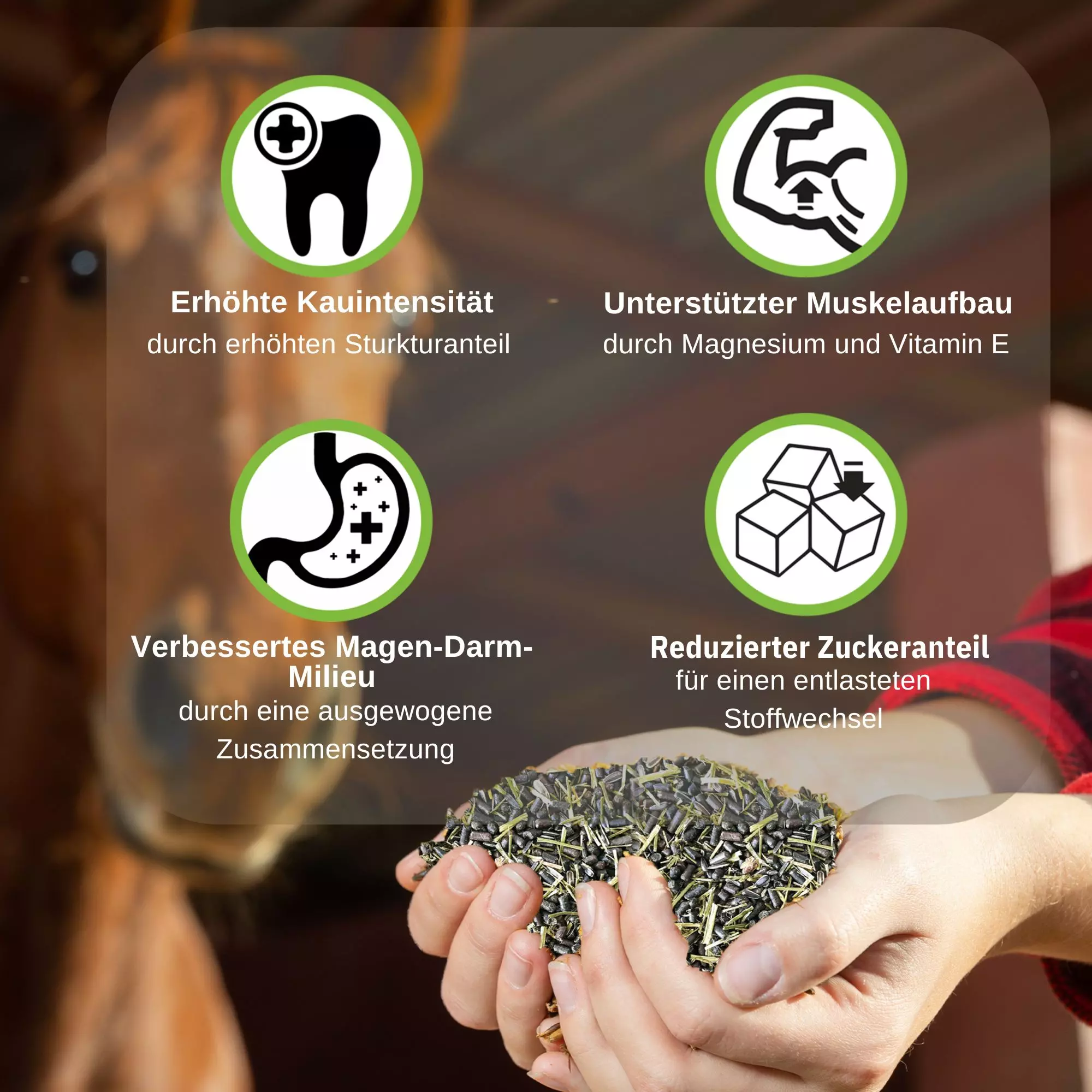 - stärke- und zuckerarm für stoffwechselkranke oder empfindliche Pferde