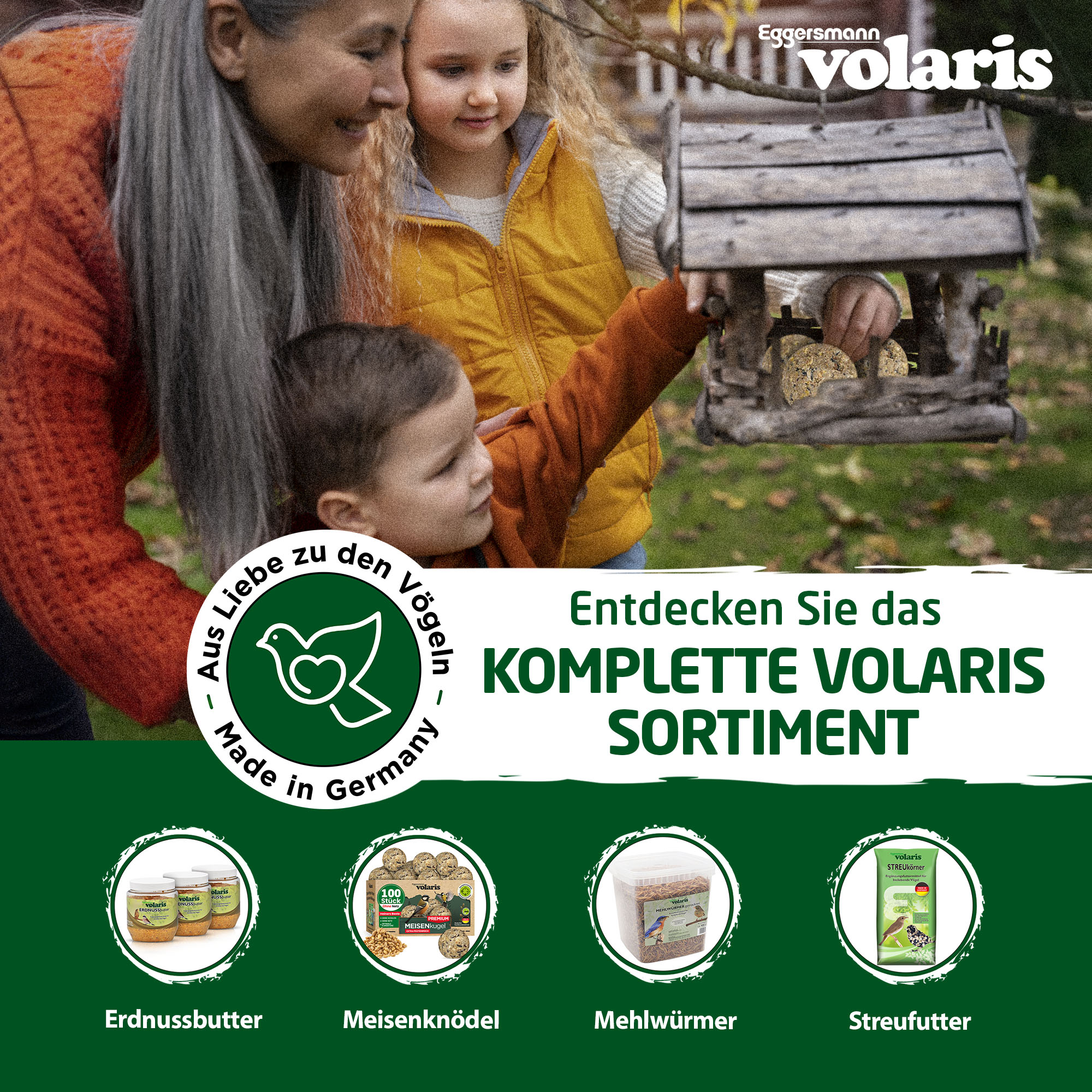 Das Eggersmann volaris Sortiment erstreckt sich inzwischen vom klassischen Fettfutter und Streufutter über Meisenknödel bis hin zur Müsli- oder Nussstange. Aufgrund der Liebe zur Vogelbeobachtung jedes einzelnen unserer Mitarbeiter können wir die gute Akzeptanz unserer volaris Produkte mit zahlreichen Verköstigungen durch verschiedenste Wildvögel belegen.