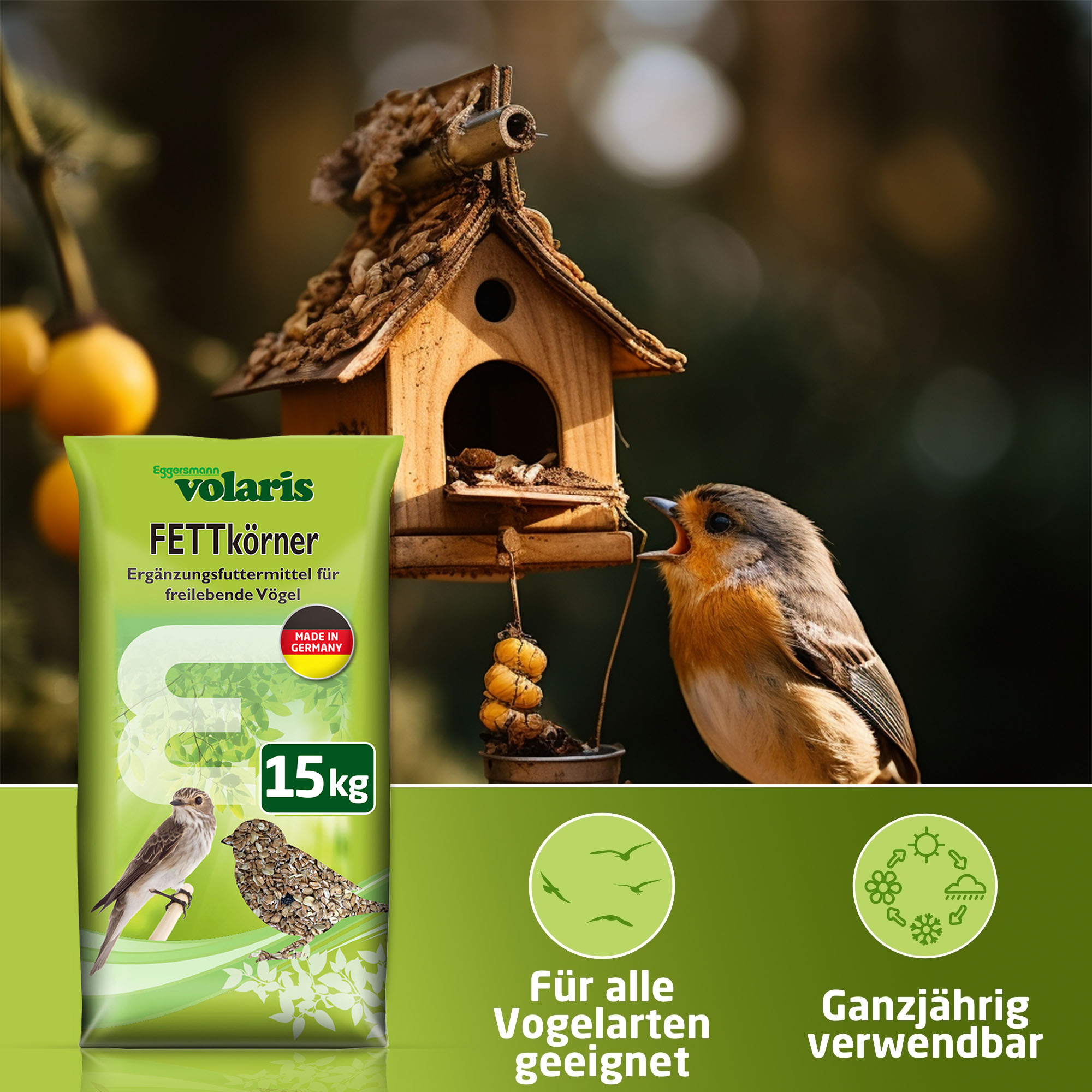 ,,"Unsere volaris FETTkörner sind für die ganzjährige Fütterung geeignet! Wenn Sie das Futter in Vogelhäusern oder Futterspendern anbieten, reinigen Sie diese regelmäßig mit heißem Wasser. Auf diese Weise minimieren Sie die Übertragung und Ausbreitung von Krankheitserregern. Achten Sie darauf, dass das Futter auch bei starkem Wind, Schnee und Regen nicht durchnässt werden kann, da es sonst verdirbt oder vereist und die Vögel es dann nicht mehr fressen.