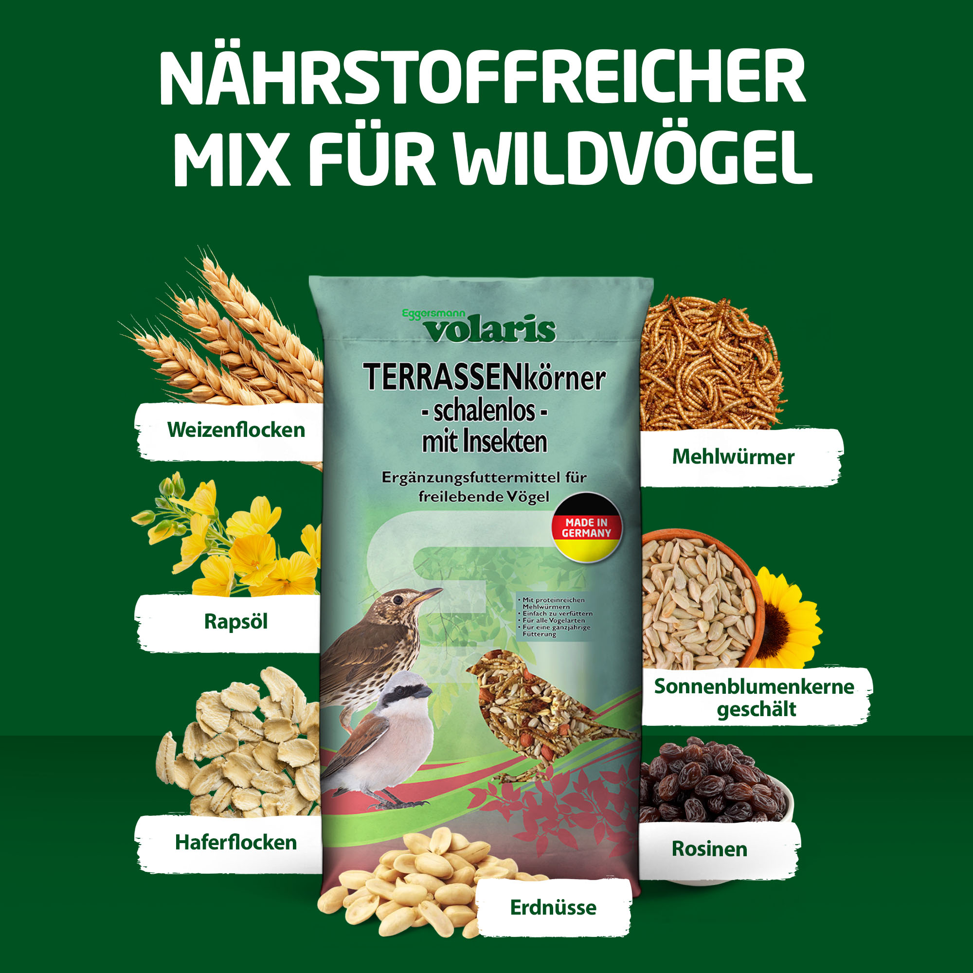 Unser Eggersmann volaris TERRASSENkörner Mix mit Insekten ist die schalenlose Proteinreiche Mischung aus auserwählten Zutaten abgestimmt auf die Bedürfnisse der heimischen Vögel und Wildvögel. Es ist besonders für die Ganzjahresfütterung an Balkon oder Terrasse geeignet, da es keine Schalen enthält, die liegen bleiben! Mit den wichtigen fett-, protein- und energiereichen Zutaten und der einzigartigen Mischung wie knackigen Getreideflocken, geschälten Sonnenblumenkernen, Erdnüssen und Mehlwürmern, bieten Sie den heimischen Vögeln eine optimale natürliche Rezeptur, die das Vogelherz höher schlagen lässt und für ein ganz besonderes Schnabelvergnügen sorgt.