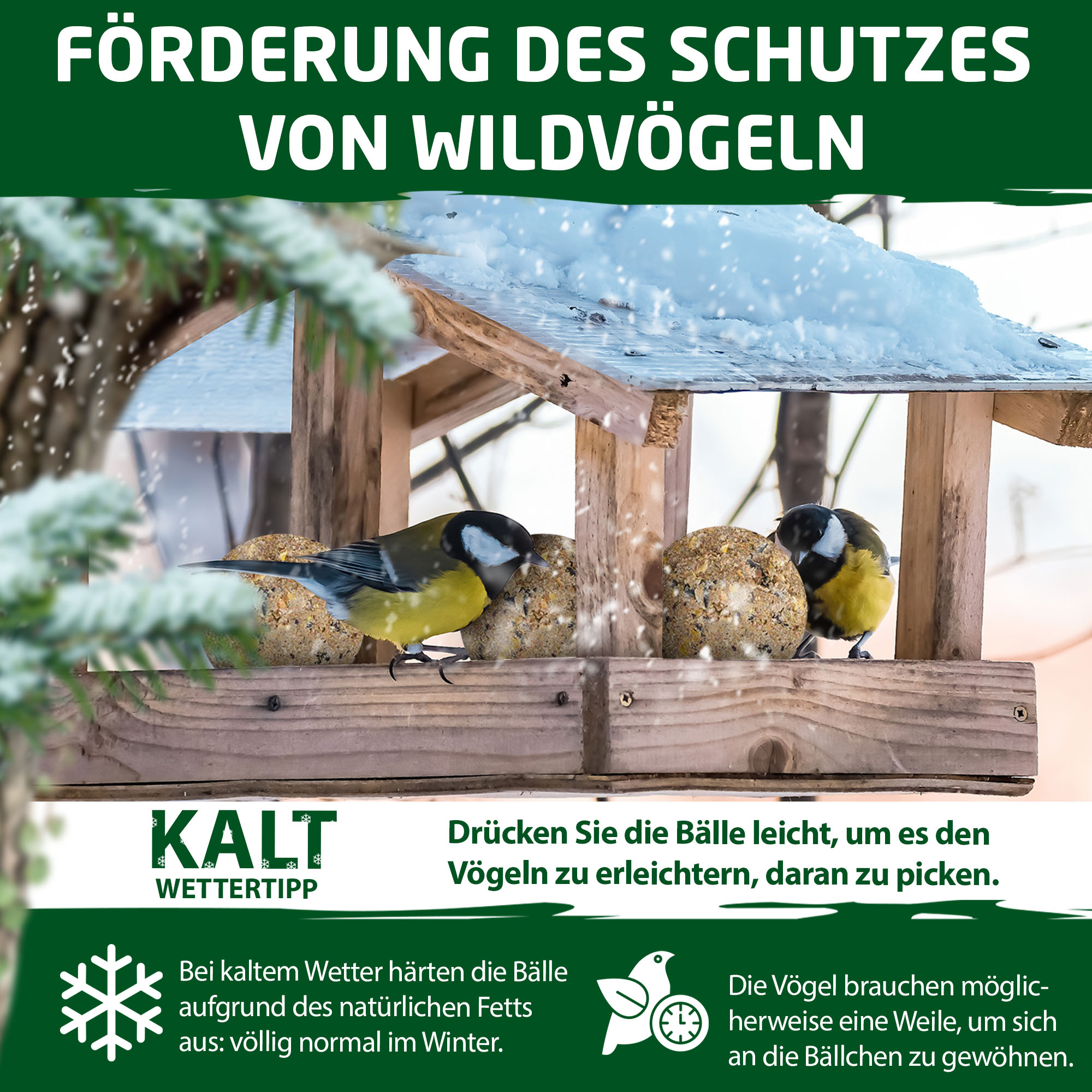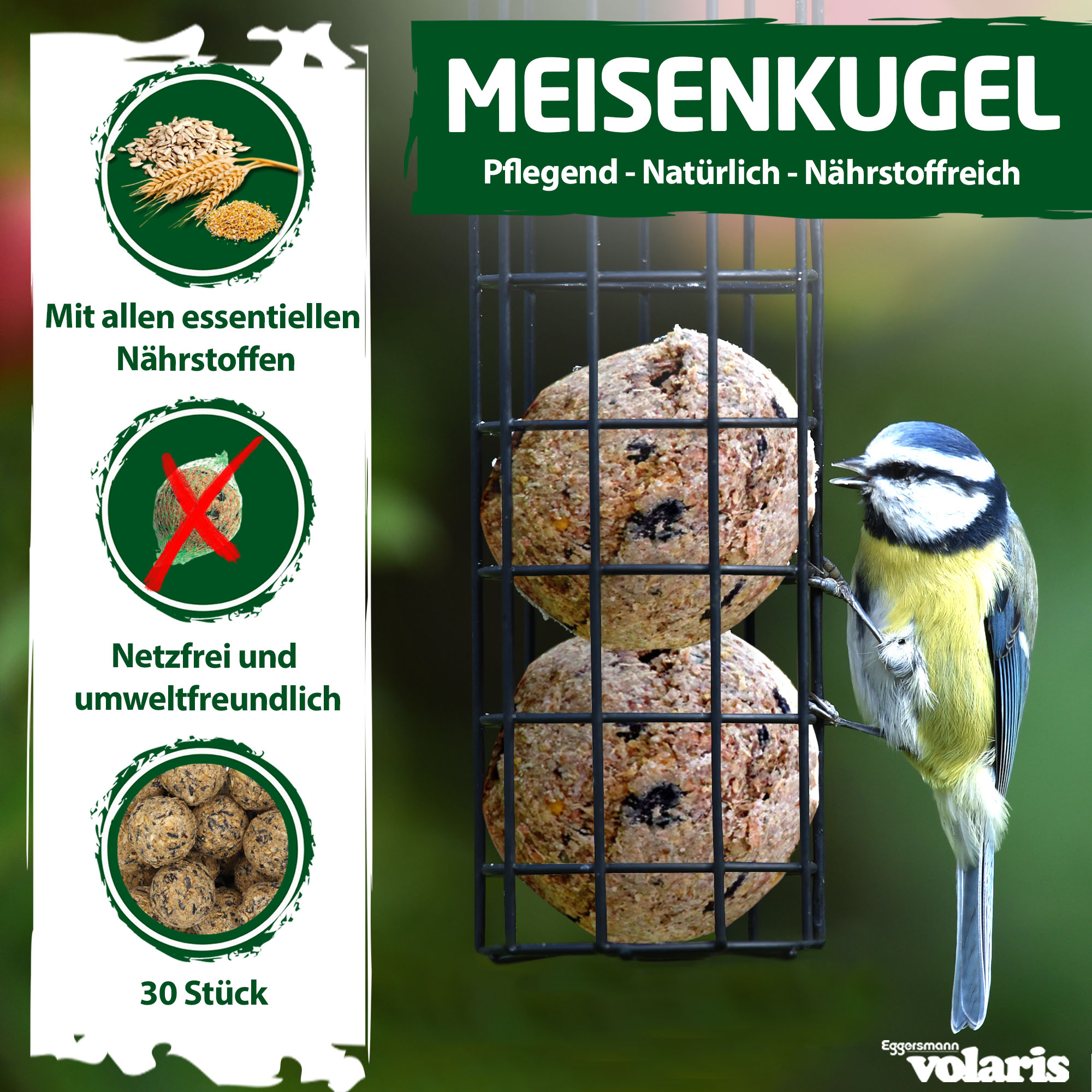 Um den Rückgang unserer heimischen Wildvögel entgegen zu wirken, sollten Sie die freilebenden Wild- und Gartenvögel mit ausreichend Nahrung unterstützen. Dafür bieten sich unsere volaris MEISENkugeln optimal an. Die vielfältige Zusammenstellung von Getreide und Saaten versorgt Wildvögel nicht nur mit Energie, sondern auch mit allen wichtigen Nährstoffen. Das Fett in den MEISENkugeln unterstützt die frei lebenden Vögel im Aufbau von Futterreserven, damit sie fit und munter durch das ganze Jahr kommen. Durch die Fütterung von volaris MEISENkugeln können Sie den Vögeln helfen und sich gleichzeitig an Ihrer Anwesenheit erfreuen.