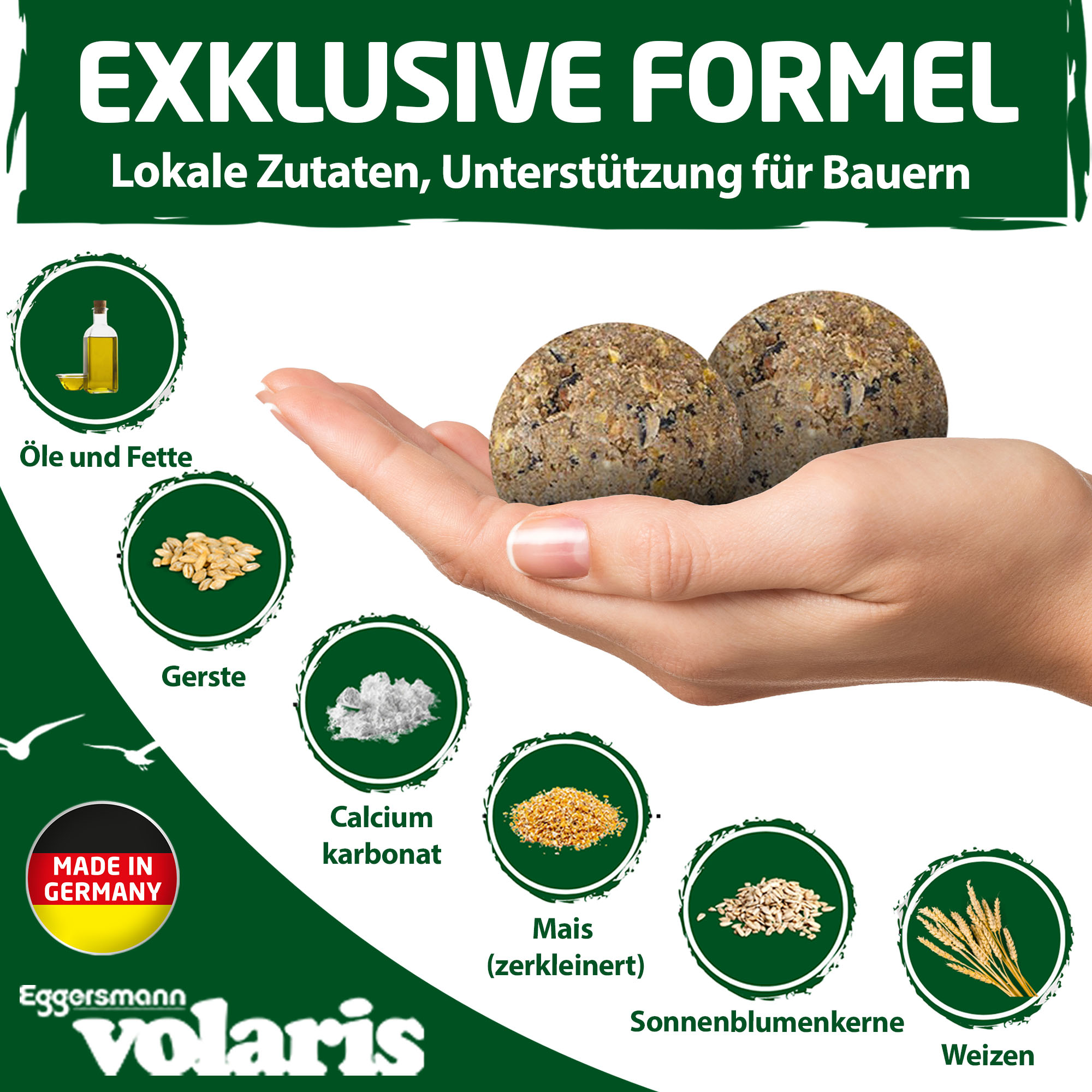 Das Eggersmann volaris Sortiment erstreckt sich inzwischen vom klassischen Fettfutter und Streufutter über Meisenknödel bis hin zur Müsli- oder Nussstange. Aufgrund der Liebe zur Vogelbeobachtung jedes einzelnen unserer Mitarbeiter können wir die gute Akzeptanz unserer volaris Produkte mit zahlreichen Verköstigungen durch verschiedenste Wildvögel belegen.