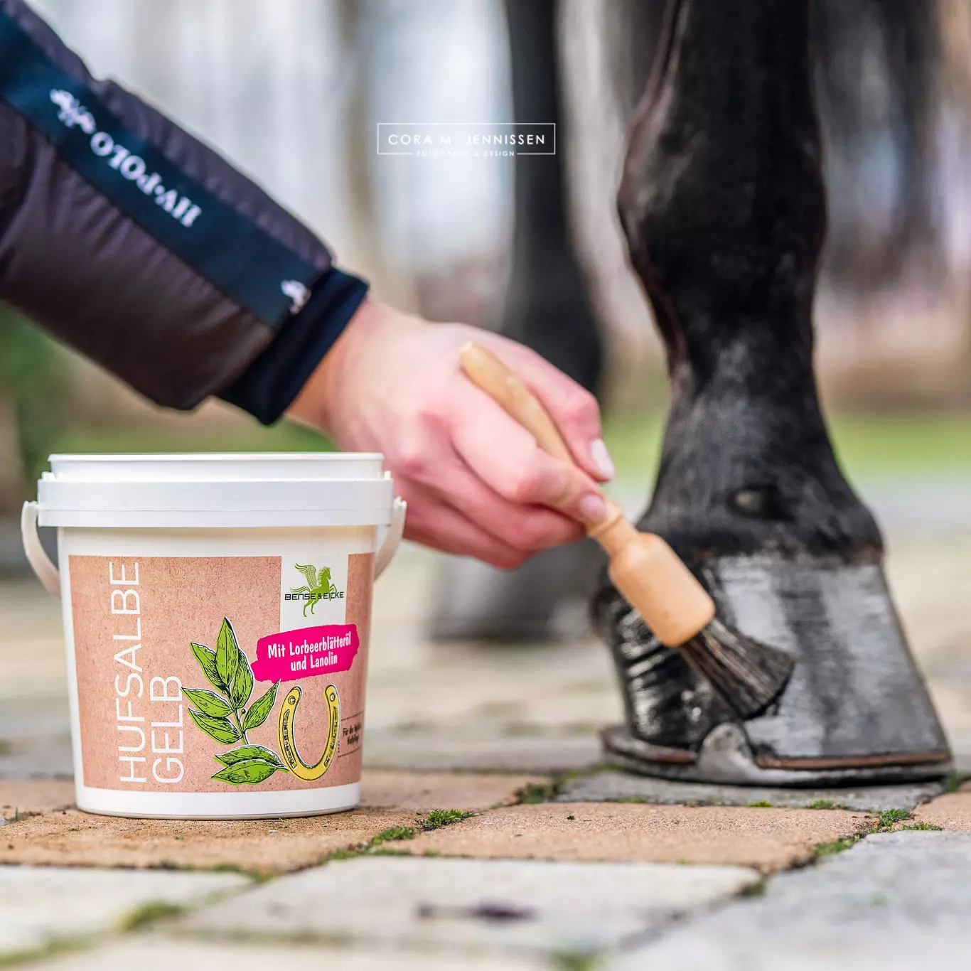 Anwendung: Nach der Hufreinigung mit einem Pinsel auf die äußere Hufwand und den Kronrandbereich auftragen. Die tägliche Anwendung bringt Schutz und Pflege für den Huf.