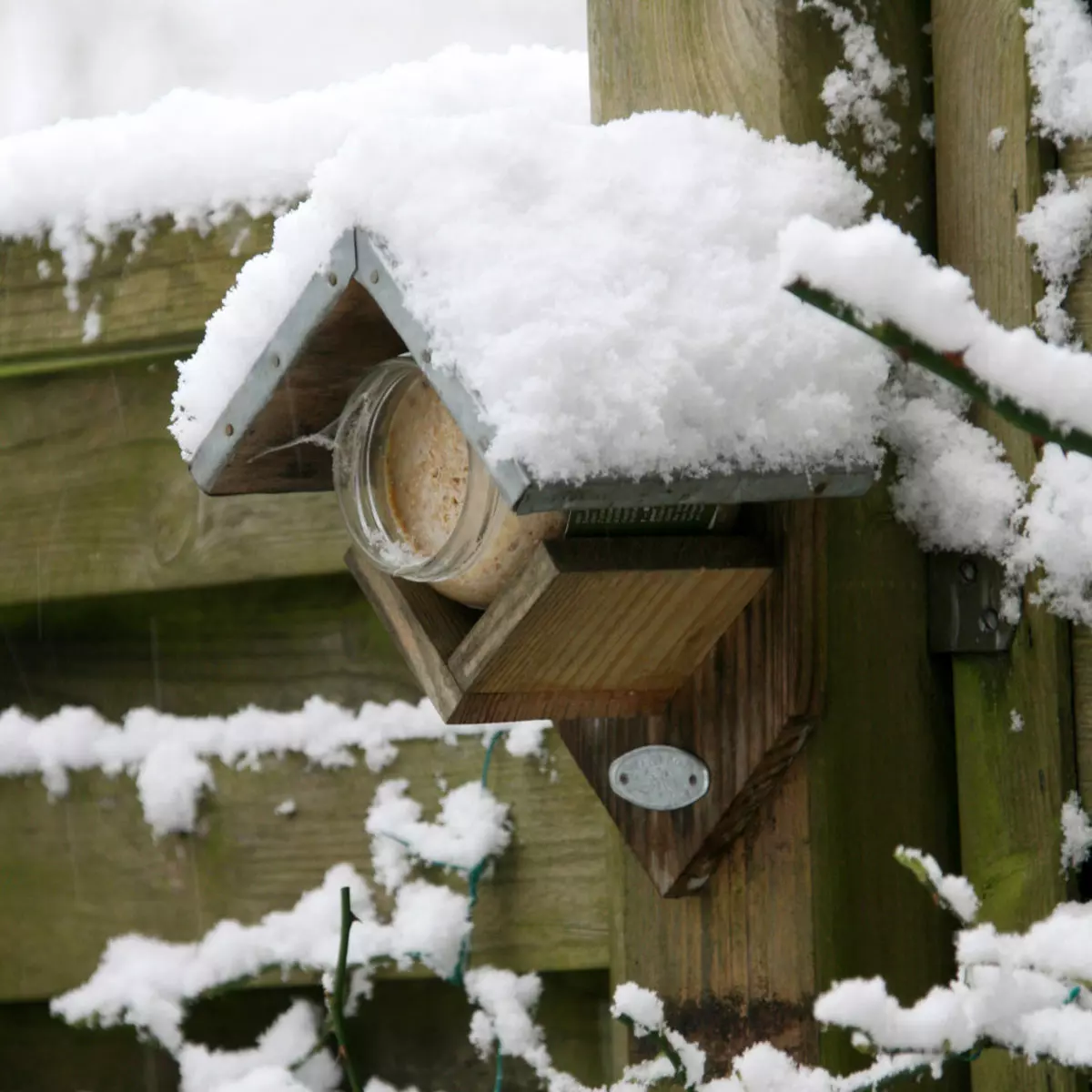 Ein Erdnussbutterbehälter sollte deshalb in keinem Garten fehlen. Diese Grundausführung aus Kiefernholz und mit Zinkdach bietet die Möglichkeit, ein Erdnussbutterglas aufzustellen. Dieses Futter zieht akrobatische Vögel wie Meisen, Spatzen, Kleiber und Spechte an.